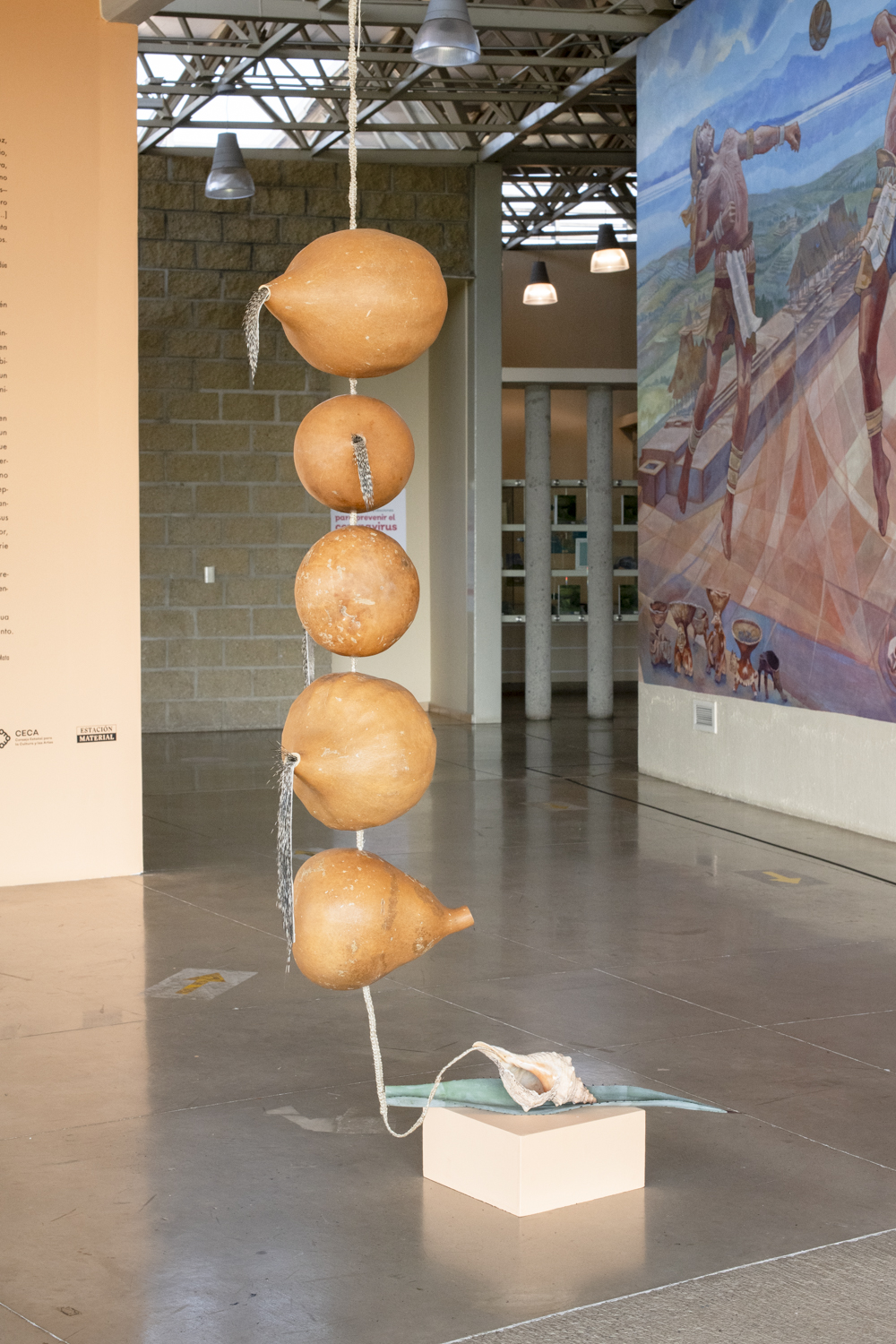 Gourds, conch, braided rope, agave leaf, Dicolytes tajacu skin