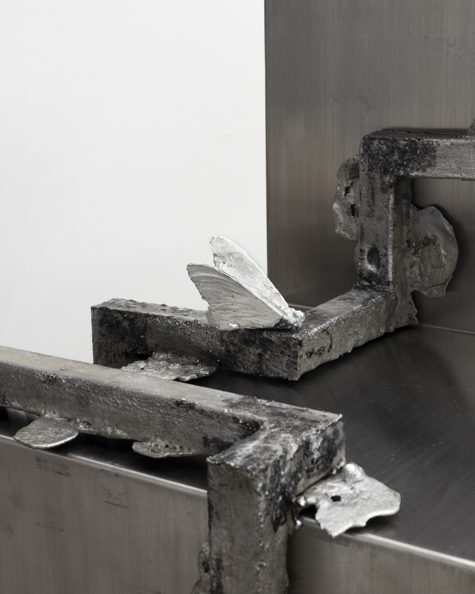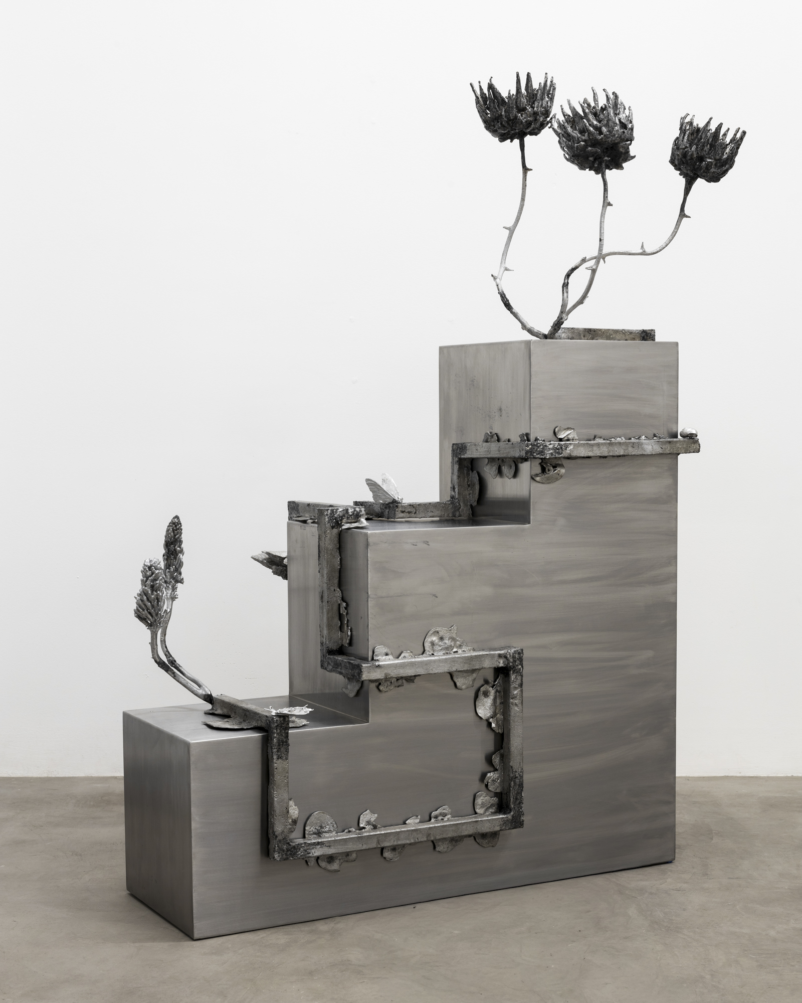 Recycled aluminum, including sculptural elements of Cynara cardunculus var. scolymus and Aloe vera flowers, Polyporales mushrooms, Ascalapha odorata nocturnal moth, Blaberus giganteus cave roach and Cornu aspersum land snail; neodymium magnets, stainless steel pyramidal base