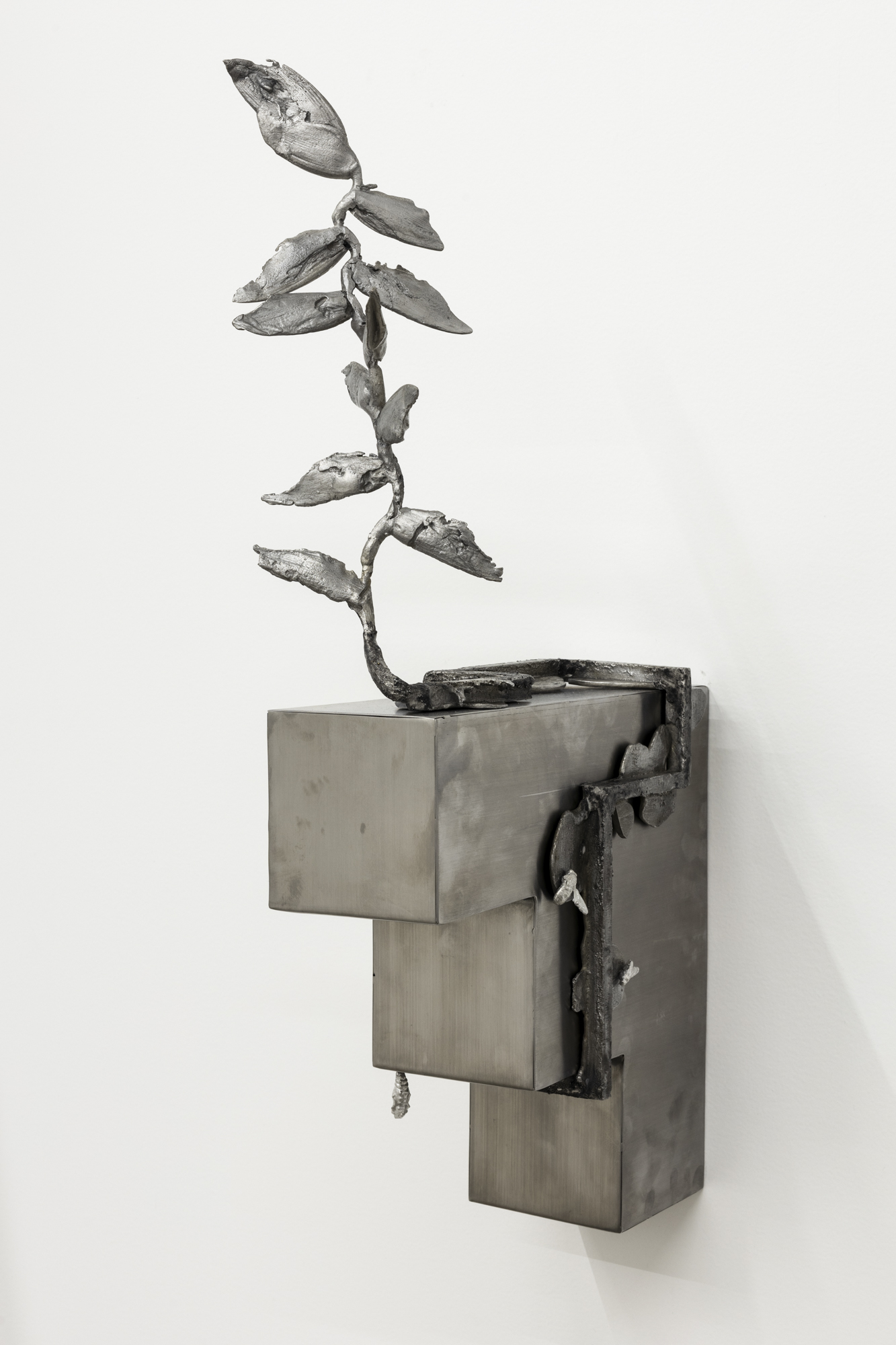Recycled aluminum, including sculptural elements of Heliconia rostrata flower, Erythrina coralloides seed pod, Xylocopa carpenter bee and Sarcophagidae fly; neodymium magnets, stainless steel pyramidal wall base