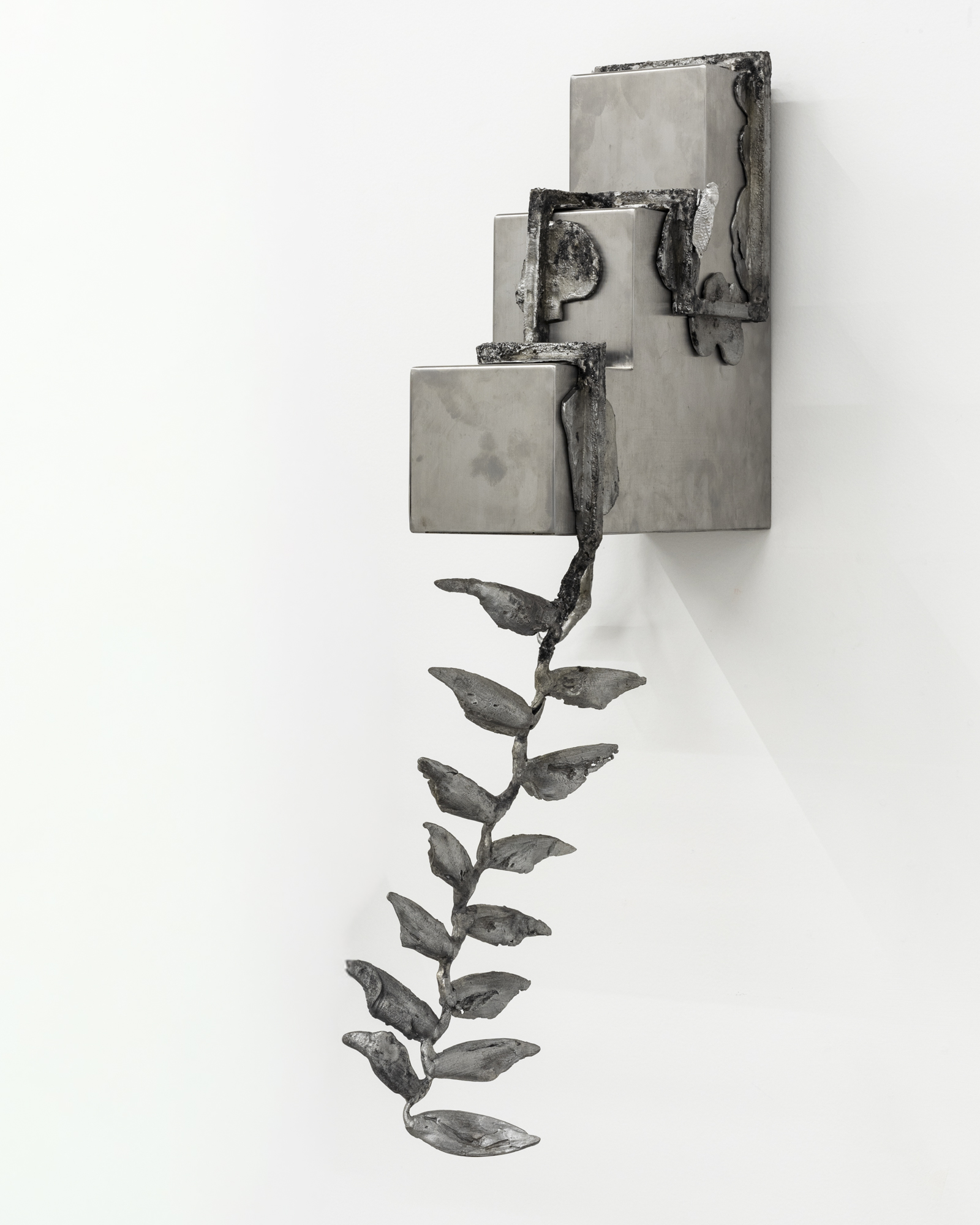 Recycled aluminum, including sculptural elements of Heliconia rostrata flower, Erythrina coralloides seed pods and Neotibicen cicadas; neodymium magnets, stainless steel pyramidal wall base