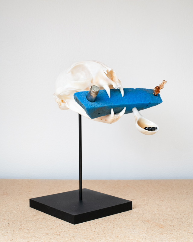 6 found objects: bobcat skull, bullet shell, porcelain spoon, amber,