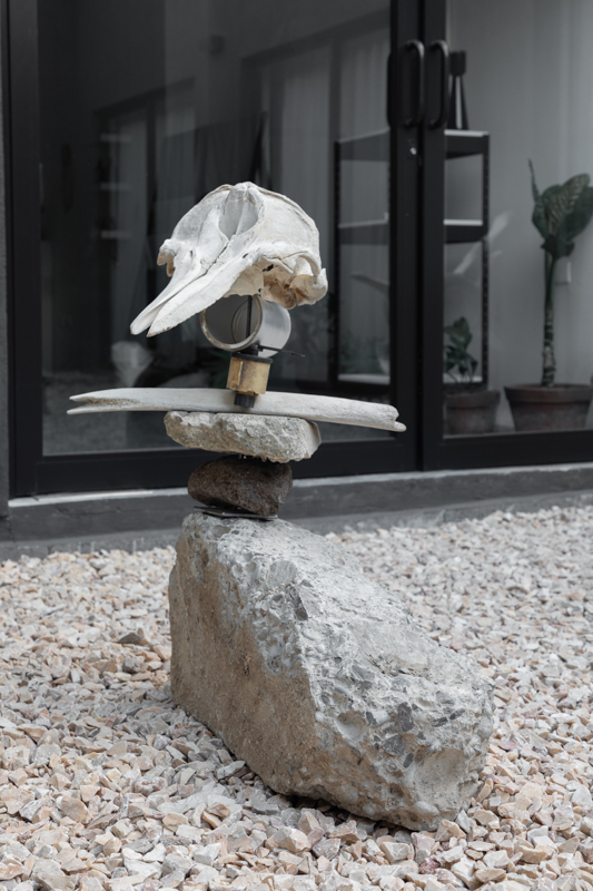 Dolphin skull, concrete, whale rib, volcanic stone, can, plastic reel, carved rock, and steel structure.